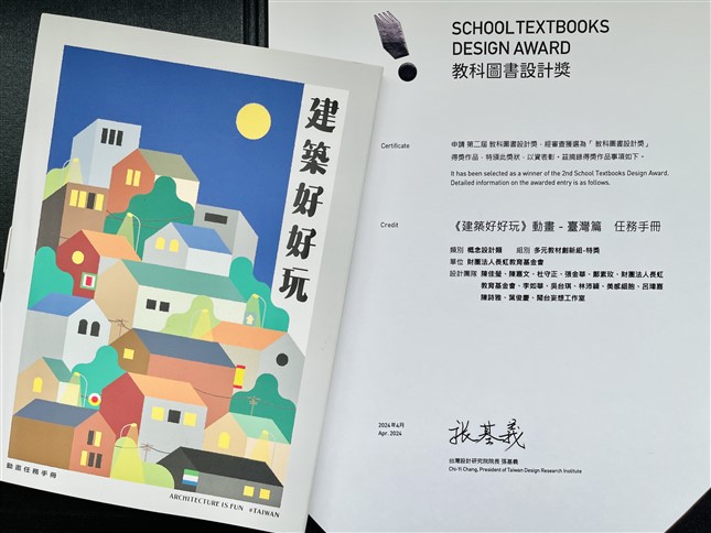 「教科圖書設計獎」是臺灣第一個以教科書為主題的設計競賽,由教育部指導、台灣設計研究院執行,今年四月於臺北松山文創園區揭曉第二屆的得獎名單,基金會為孩子們打造的《建築好好玩》動畫臺灣篇-任務手冊,從688件參賽作品中脫穎而出,在概念設計類-多元教材創新組獲得「特獎」殊榮!