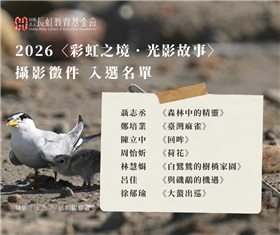 2026.2基金會秉持著分享與傳承美善的信念,盼與大眾一起發現環境之美。感謝響應2026第一屆〈彩虹之境.光影故事〉攝影徵件的創作者,本屆我們收到許多精彩,讓我們看見台灣生態的多元樣貌。恭喜以下獲選者...